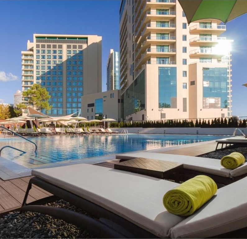В самом сердце комплекса раскинулся открытый бассейн с подогревом — идеальное место для расслабления в любое время года. Пространство вокруг бассейна оформлено с вниманием к деталям